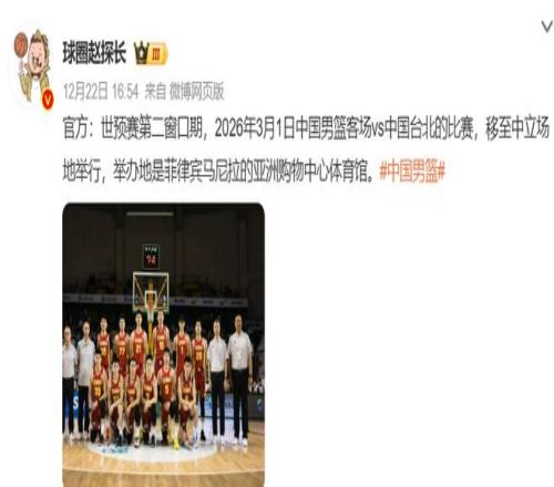 值得一提的是,明年3月1日中国男篮VS中国台北队的比赛,将移至中立场地举办,地点位于菲律宾马尼拉的亚洲购物中心体育馆。