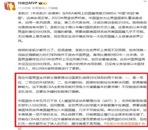李凯尔目前仍是中国国籍,意味着未来依然有资格代表中国男篮出战FIBA比赛。